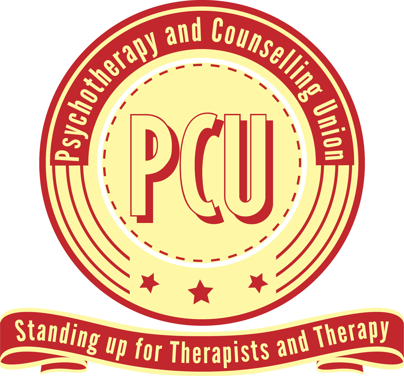 Logo of Psychotherapy and Counseling Union, with the acronym PCU in the center and a red and yellow color scheme, featuring circular text and a banner below that reads 'Standing up for Therapists and Therapy'.